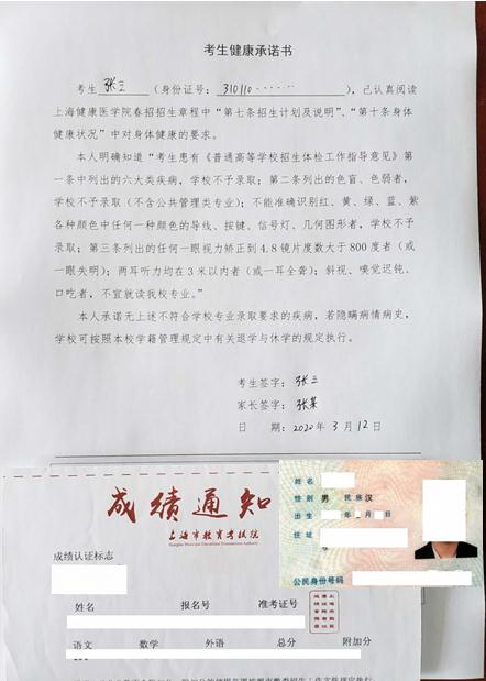 2、将考生本人身份证、成绩通知单与考生健康承诺书共同拍照或扫描形成电子版,并保证文字内容清晰,摆放样式见上传样张。